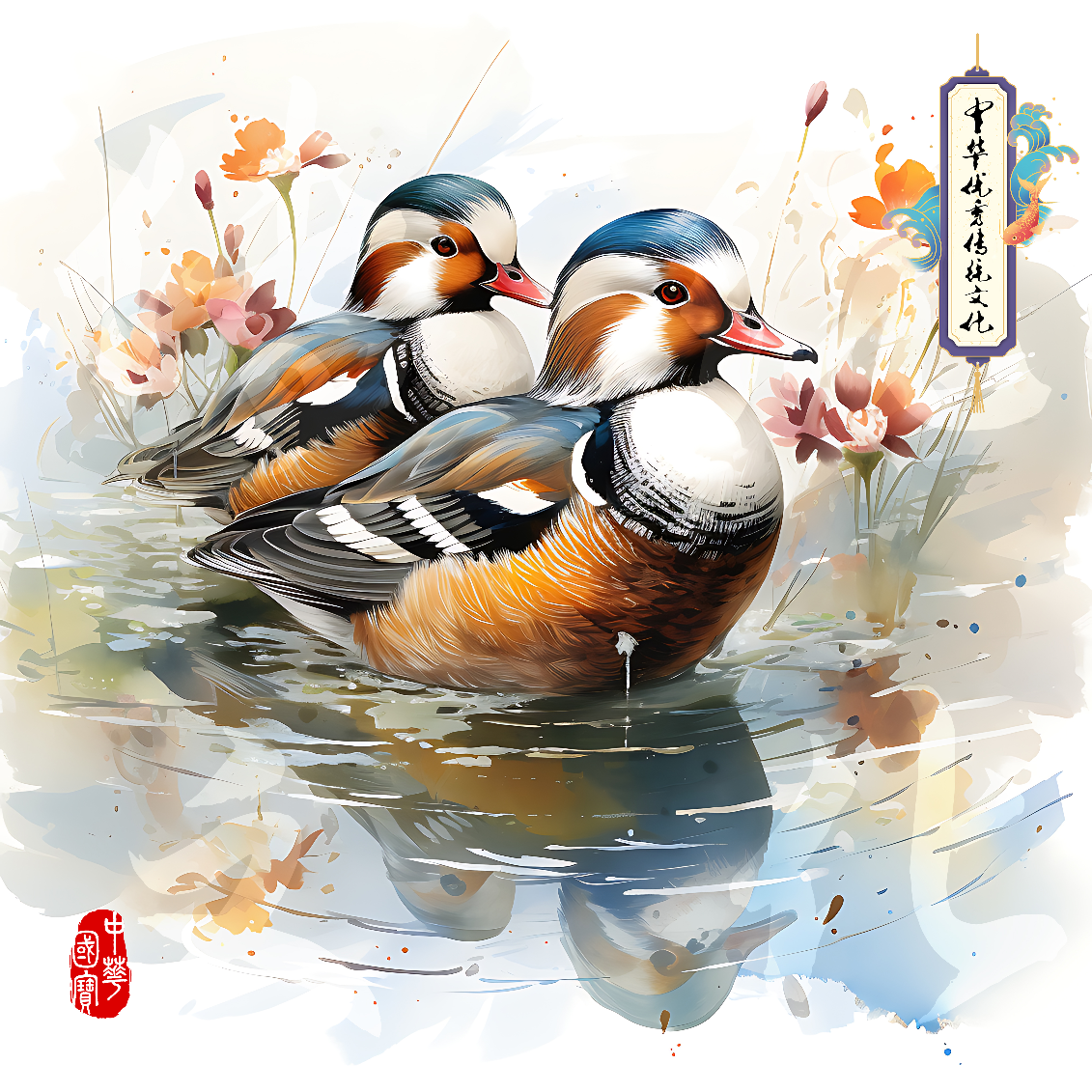和谐游泳-墨韵双鸳-中华优秀传统文化
