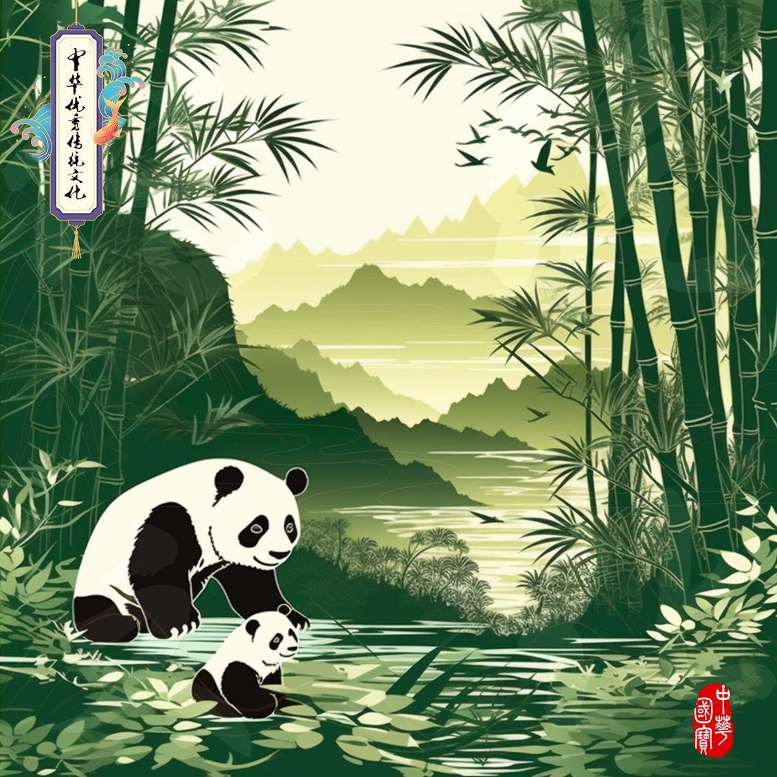 竹影抚熊-熊猫版画-中华优秀传统文化