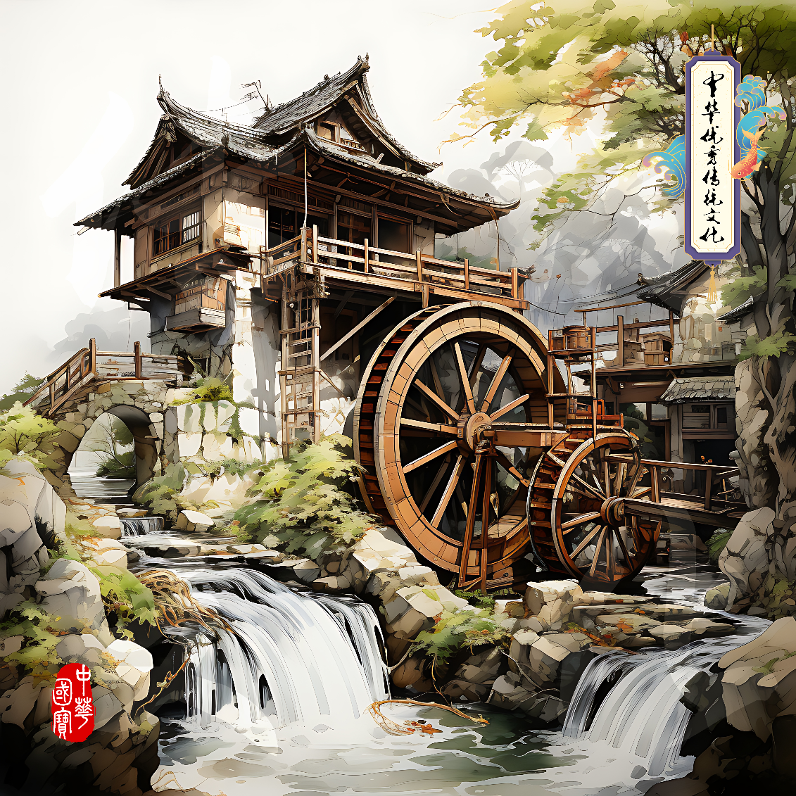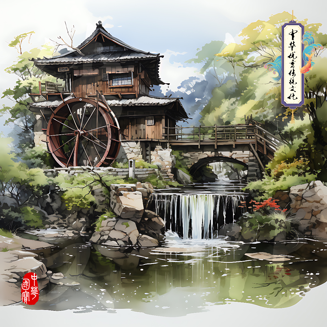 悬崖寺庙与水车-乡间水车-中华优秀传统文化