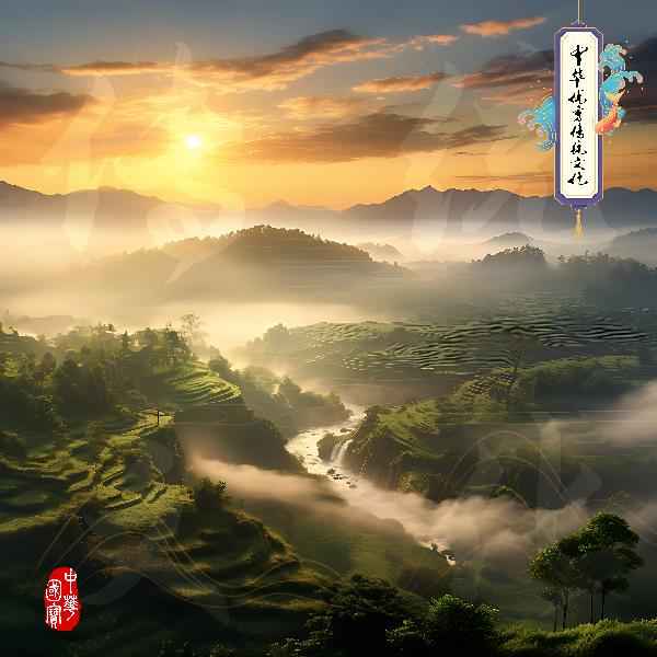 云海-山村日出-中华优秀传统文化