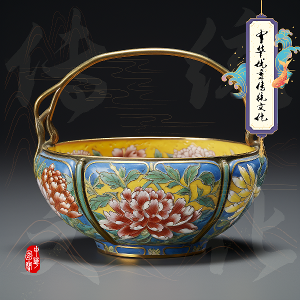 金色花蓝-乾隆画珐琅牡丹纹花篮-中华优秀传统文化