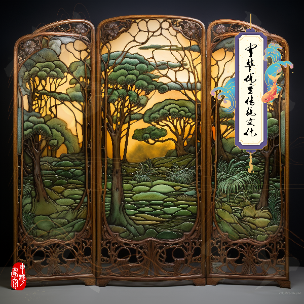 树纹屏-紫檀木边画山水图围屏-中华优秀传统文化