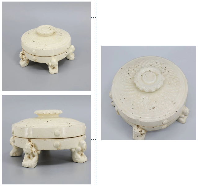 此白瓷砚圆形,砚面上凸。砚体及水槽均施白釉,釉薄光润, 砚边内凹,形成圆形水渠,用于处于储存墨汁。