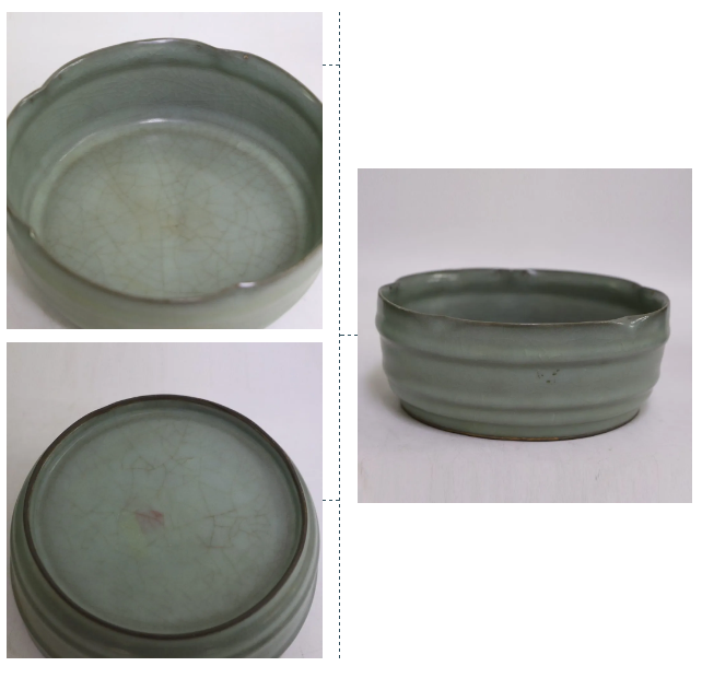 此件龙泉系官窑花口洗,香灰色胎质地坚硬厚重,釉水莹润丰腴,玉感强烈,开片自然,整体器型规整,保存完好。