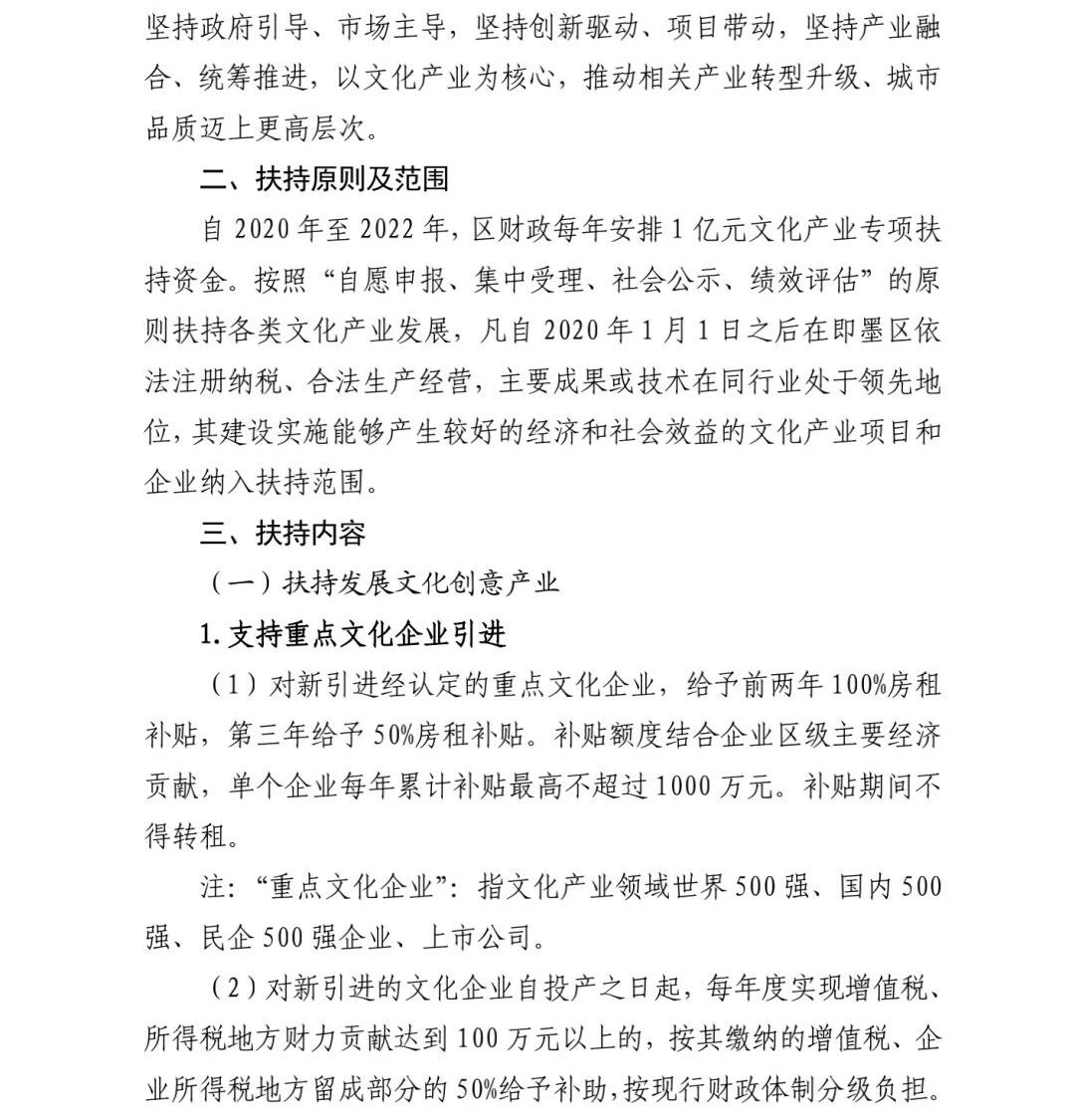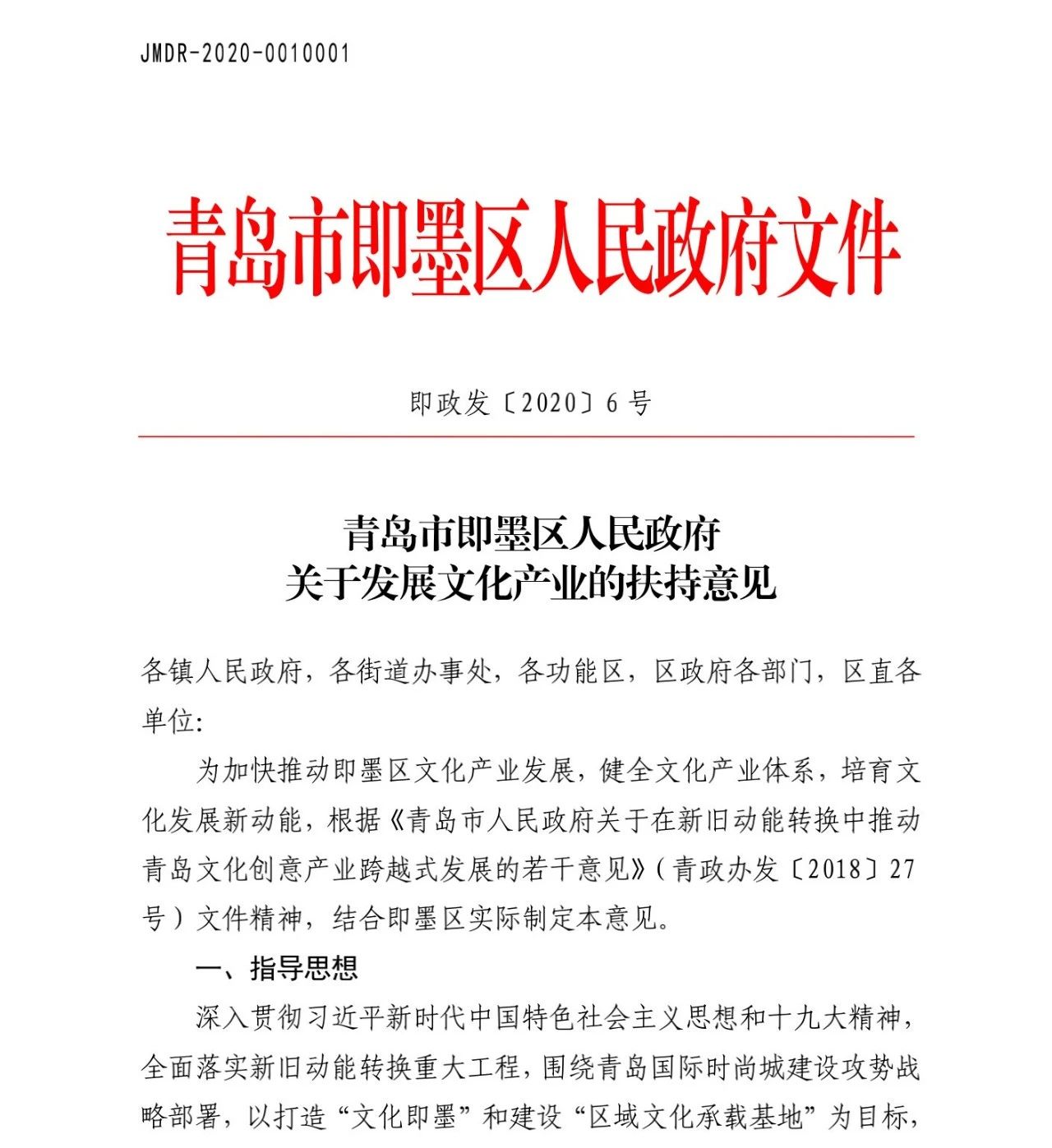 2月23日,青岛即墨区人民政府印发《青岛市即墨区人民政府关于发展文化产业的扶持意见》,《意见》中提出重点发展音乐产业,明确了音乐产业项目及人才引进政策。其中,不同规模的音乐企业可获得10万、20万、30万和50万的一次性奖励;音乐工作室根据财力贡献可获得60%或80%的补助。