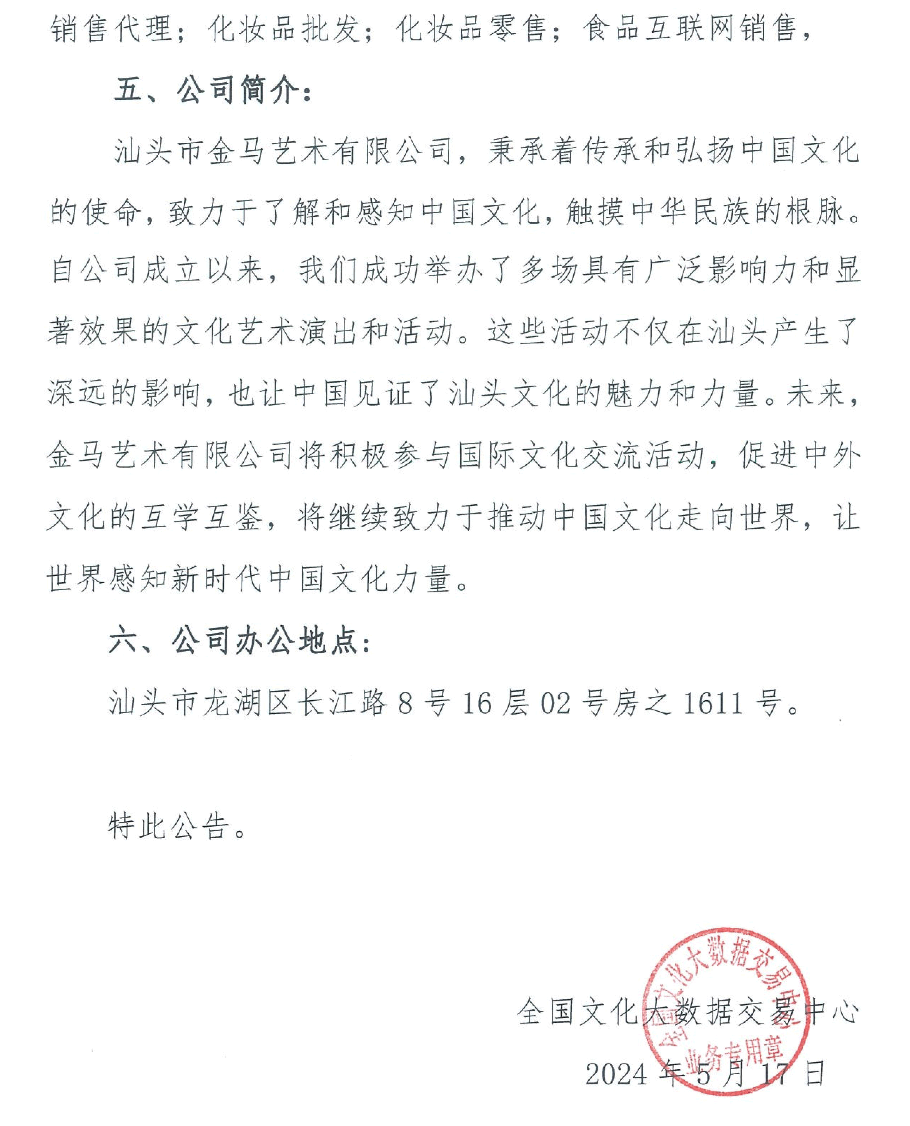 公告丨全国文化大数据交易中心交易主体进场公告【汕头市金马艺术发展有限公司】