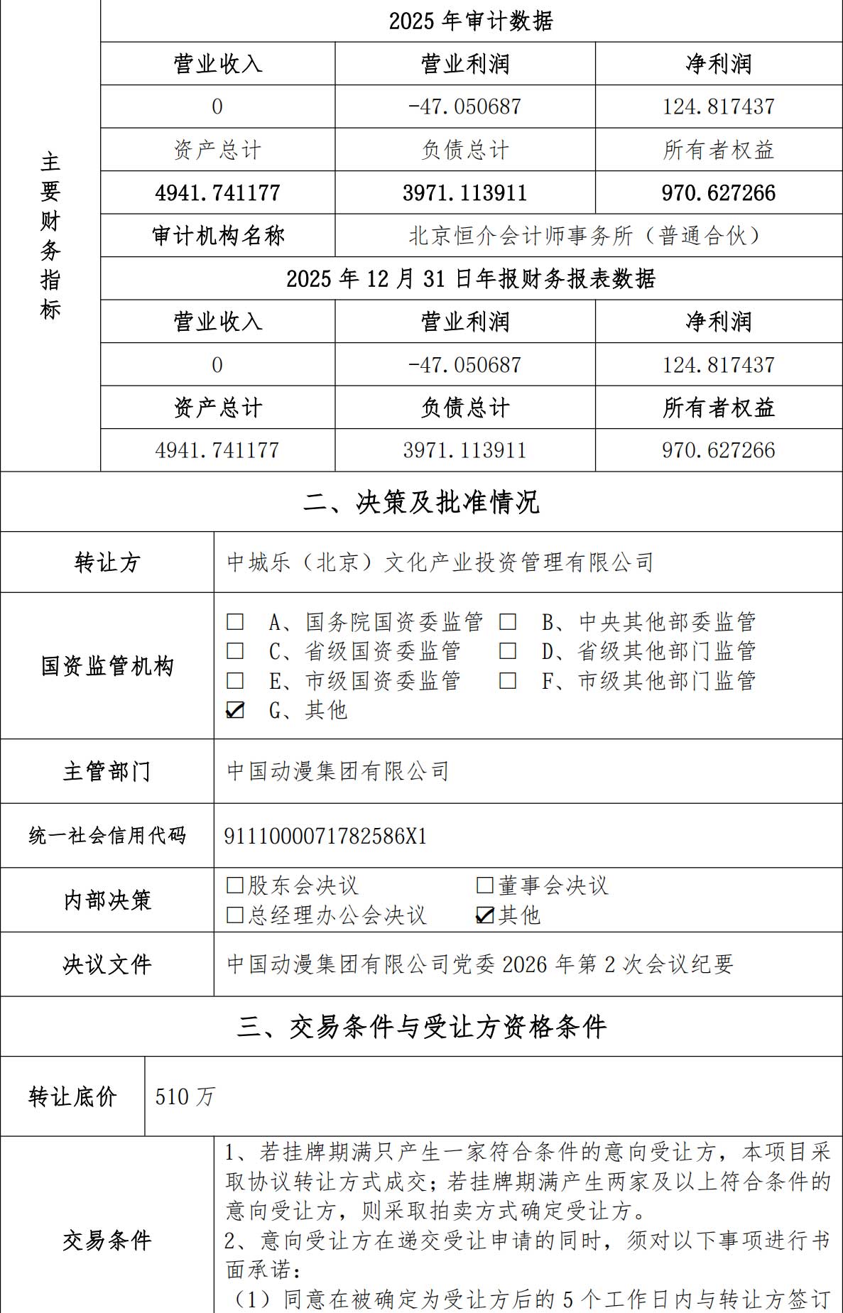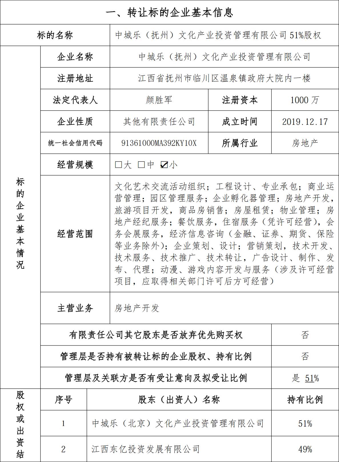 国有业务丨中城乐(抚州)文化产业投资管理有限公司51%股权转让信息预披露公告