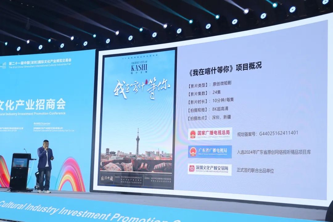 在招商大会上,文化润疆·数字赋能——深喀数字系列项目作为深圳文化产权交易所的重点推介项目重磅亮相现场,包含超高清原创微短剧《我在喀什等你》、喀什地区文旅产业合作招商项目、塔县文旅项目。此次推出的系列项目,由深圳文化产权交易所与众多政企相关方,共同围绕国家“文化润疆”战略进行打造,深度推动深圳与喀什在文化领域的合作。