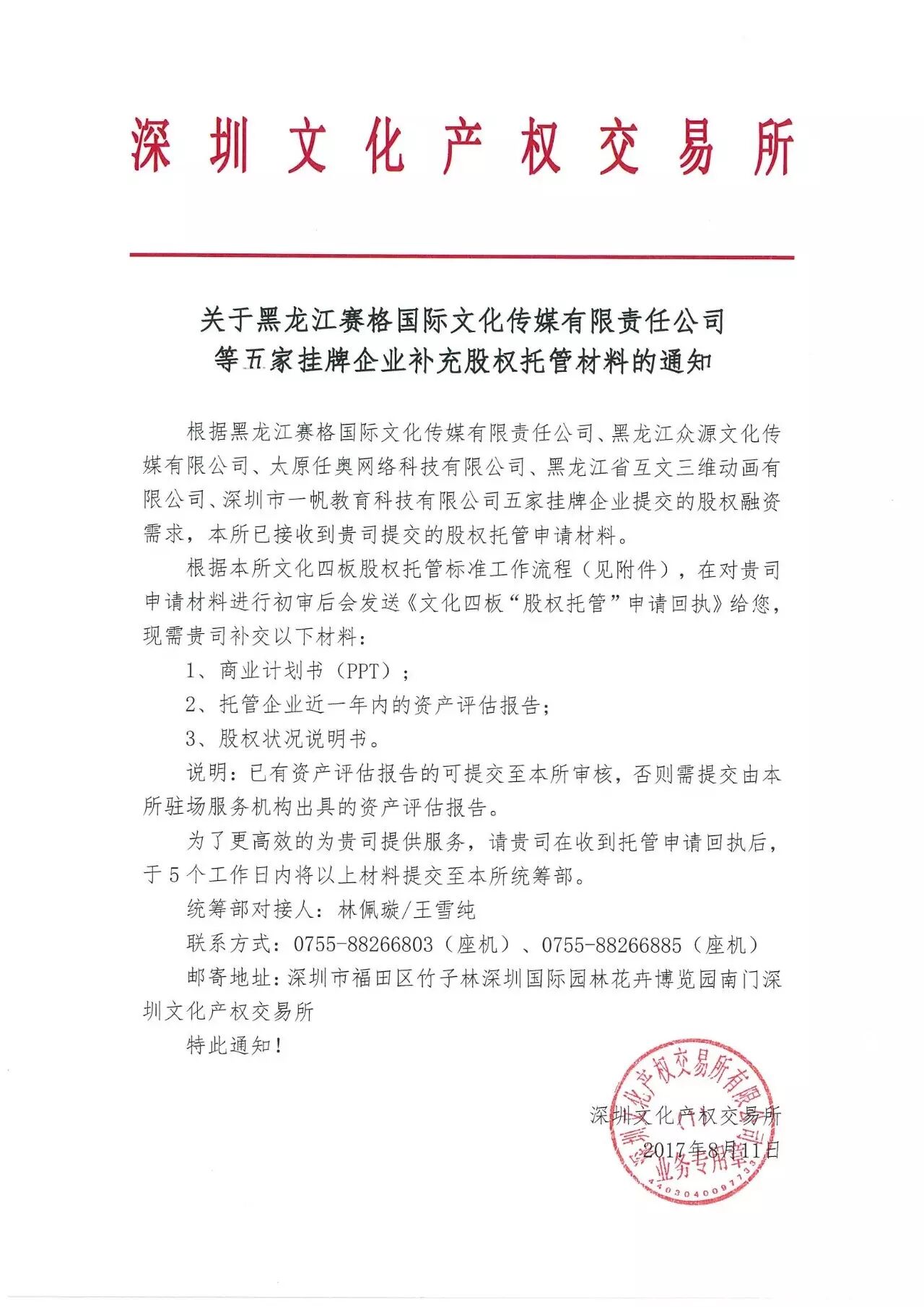 关于黑龙江赛格国际文化传媒有限责任公司等五家挂牌企业补充股权托管材料的通知