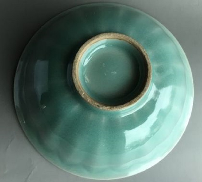 南宋晚期撇口,弧下收,圈足,碗外腹刻宽仰莲纹一圈,刀法流畅纯熟,制作精美,施粉青釉,口沿、莲瓣脊背釉薄处隐现白色,呈色不一,形成优美的装饰效果,底胎呈朱红色。