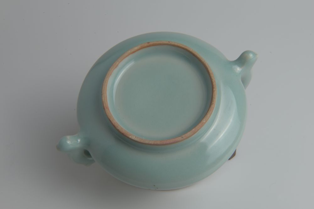 宋人仿古尚美,美在古意盎然,此器形体流畅,工整。口沿外撇,颈部有两道凸弦纹。鼓腹,腹壁上有一对龙耳,苍劲、比例协调。通体施娇艳的梅子青釉,釉色肥厚莹润,具有青玉般的效果。器口一圈芒口,足底露胎,胎体加入含铁的紫金土,故胎色白中带灰,符合梅子青釉瓷器的特征。露胎处显现浓艳的火石红。