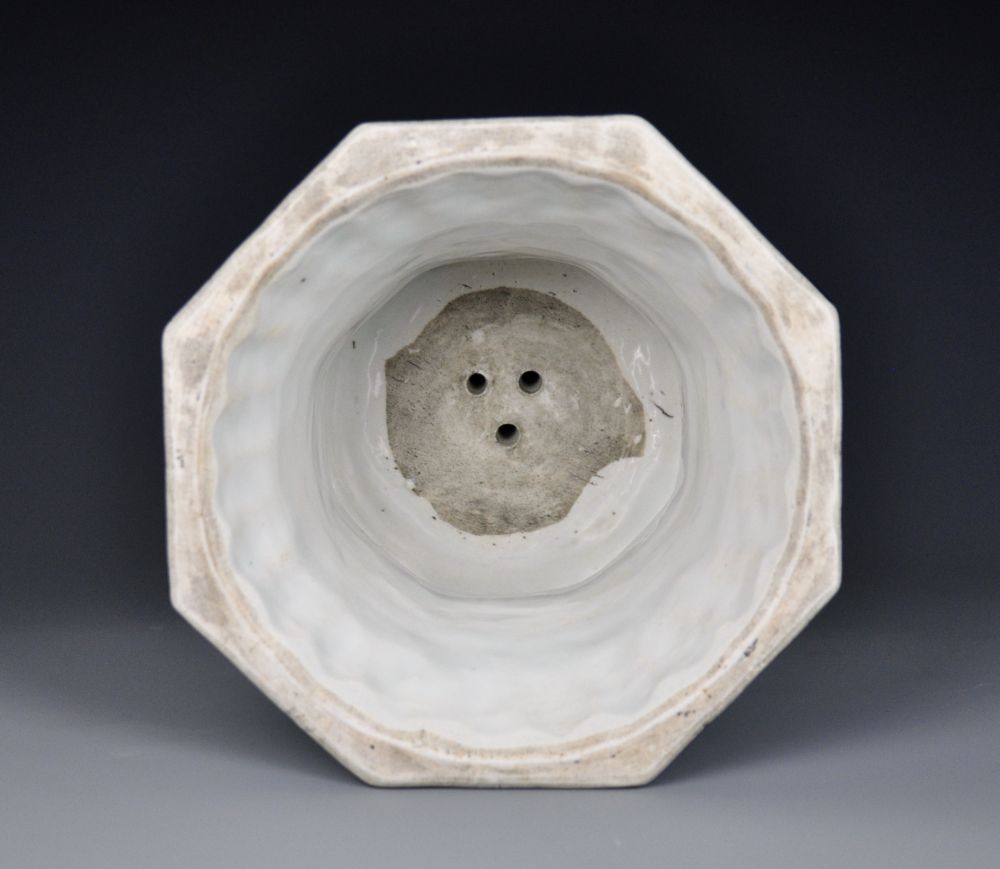烛台为八方式,分为上、中、下三层,上层为烛插,下层为台座,两者均为束腰八方形,中层为连柱,形状如酒盅倒扣。通体青花装饰。烛插由上到下分别描绘蕉叶纹、回纹、变形莲瓣纹。连柱饰有锦纹及缠枝花纹。台座面饰海水纹和莲瓣纹各一周,外壁八面绘八组各式缠枝花卉。足内施白釉。底心无釉。此八角烛台仿自阿拉伯铜器,结构复杂,装饰华美。绘制纹样使用的青料为进口钴料,即所谓的“苏泥勃青”,青花色泽浓艳,有晕散感。此青花烛台造型别致新颖,端庄规整,融会中西文化之优点,是完美的艺术结合,为中国陶瓷史上显赫彪炳的珍品。