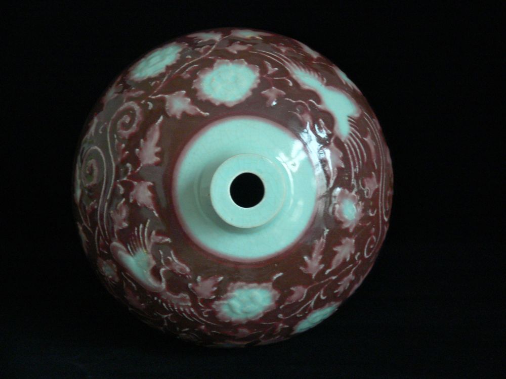 元代釉里红,景德镇创烧,以氧化铜为颜色剂,经高温一次烧成。因为釉下彩,故称釉里红。元代釉里红瓷器难有大器,称“瓷中贵族”,釉里红线绘开光梅瓶,胎质细腻坚致,胎底略带火石红,呈色艳丽,稍显暗红,略带绿斑,开窗轮廓处有晕散现象,梅瓶折沿,细颈,丰肩,肩以下渐敛,圈足。此梅瓶是元代瓷器生产技术进步的重要标志,是难得的精品。