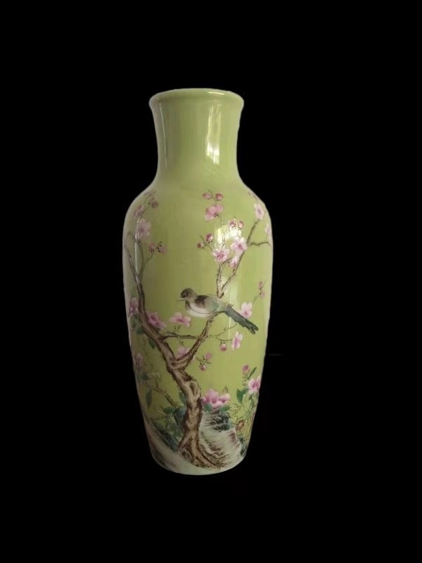 该瓶器型规整,瓷质细腻坚致,釉面温润,泛蛤蜊光,喜上眉梢花鸟纹栩栩生动,诗、书、画、印交相辉映,无一不精,实为珐琅彩精品瓷器,且自然使用,老化痕迹明显。