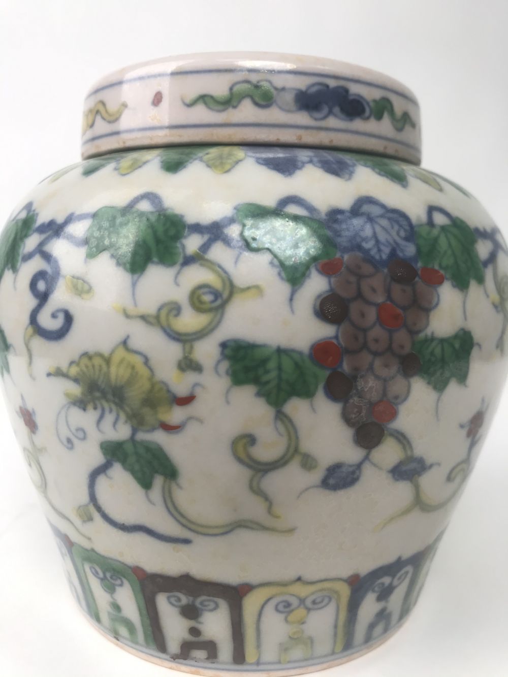 此罐带盖,盖微凸。罐直口,劲短,丰肩,肩以下渐收至圈足。罐,通体斗彩绘画,肩部绘纹饰一周,腹部主题为葡萄纹,间以叶子,蝴蝶纷飞相辅,刻画生动,层次分明,色彩明快清新,新象逼真,罐下部由红黄蓝绿四色绘一圈纹饰。底部边缘两圈蓝色线,外深内浅,底部署青花楷书“天”字。罐胎精细洁白如玉,釉面宝光莹润,完美的器型设计和杰出画师的高超绘画技术形成伟大的艺术品!