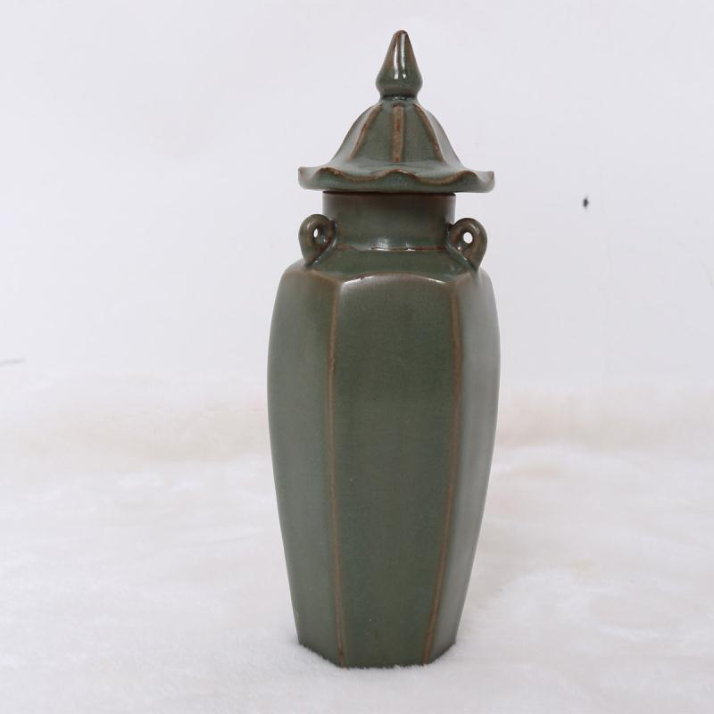 此藏品小巧玲珑,巧夺天工,墨绿色施釉也在瓷器中非常罕见。有两部分组成,瓶盖和瓶身,瓶盖是有圆形莲花瓣做底,然后胎体向上收拢。八个莲花瓣对应八条筋,用鸡心塔尖收顶,难得的是小小的塔尖上也有八根线条,塔尖上的线条,盖身上的线条。瓶身上的线条,盖子盖上去以后。线条从瓶底到塔尖完全对照,给人有一种浑然一体的感觉。在瓶身的口沿有三个系绳孔刚好在线条的正中间。整个藏品把工艺之巧,工艺之美发挥的淋漓尽致!