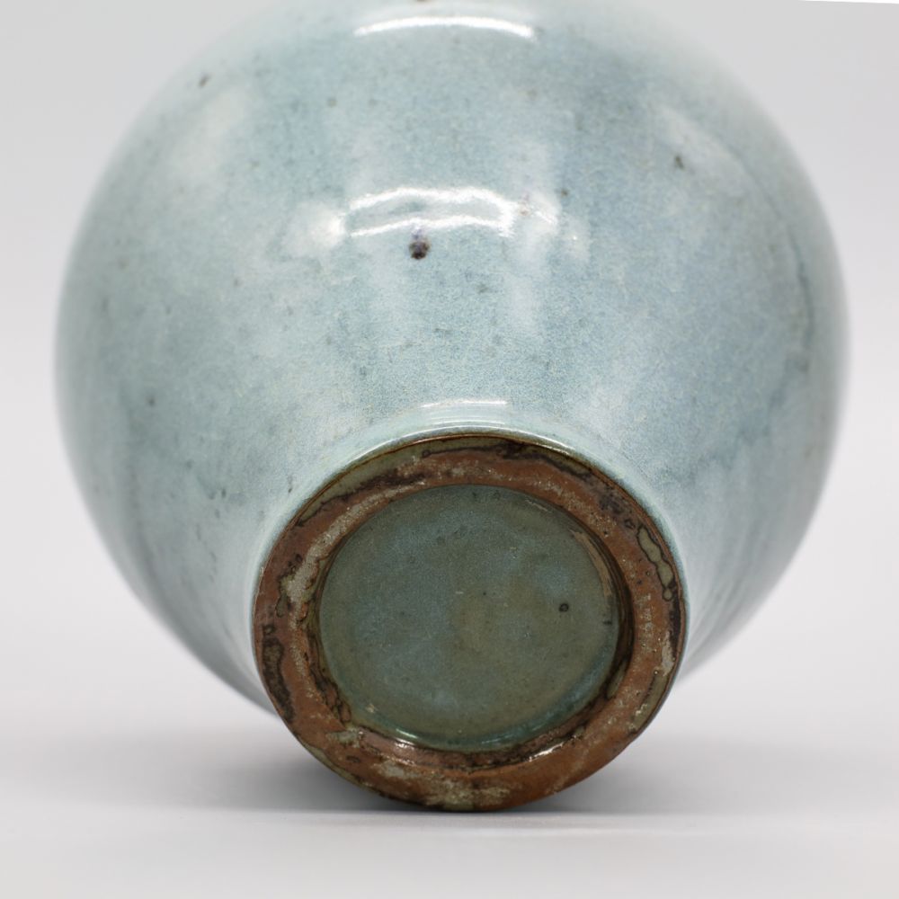 钧瓷始于唐、盛于宋,是中国古代五大名瓷之一, 并以其独特的釉料及烧成方法产生的窑变神奇而闻 名于世。它独特的窑变艺术,以其“入窑一色,出窑万彩“的艺术特点广受陶瓷爱好者喜爱。此器物撇口, 短颈,溜肩,鼓腰,收腹,天青秞亮丽,圈足