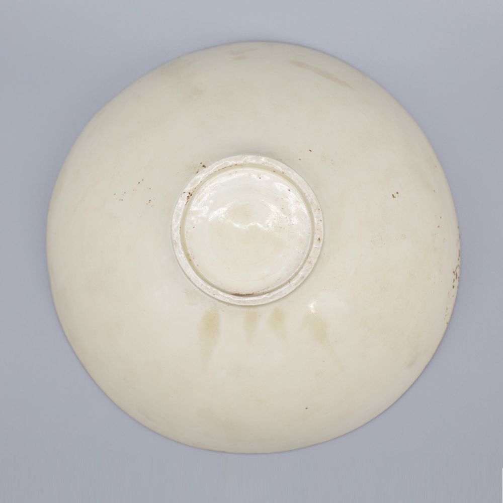 此器物内外施釉,有流釉状,广口,斜壁,小圈足。胎质相当细腻坚至,而且非常薄,碗内壁为鸳鸯与莲花,碗心为一小团水波游鱼纹。
