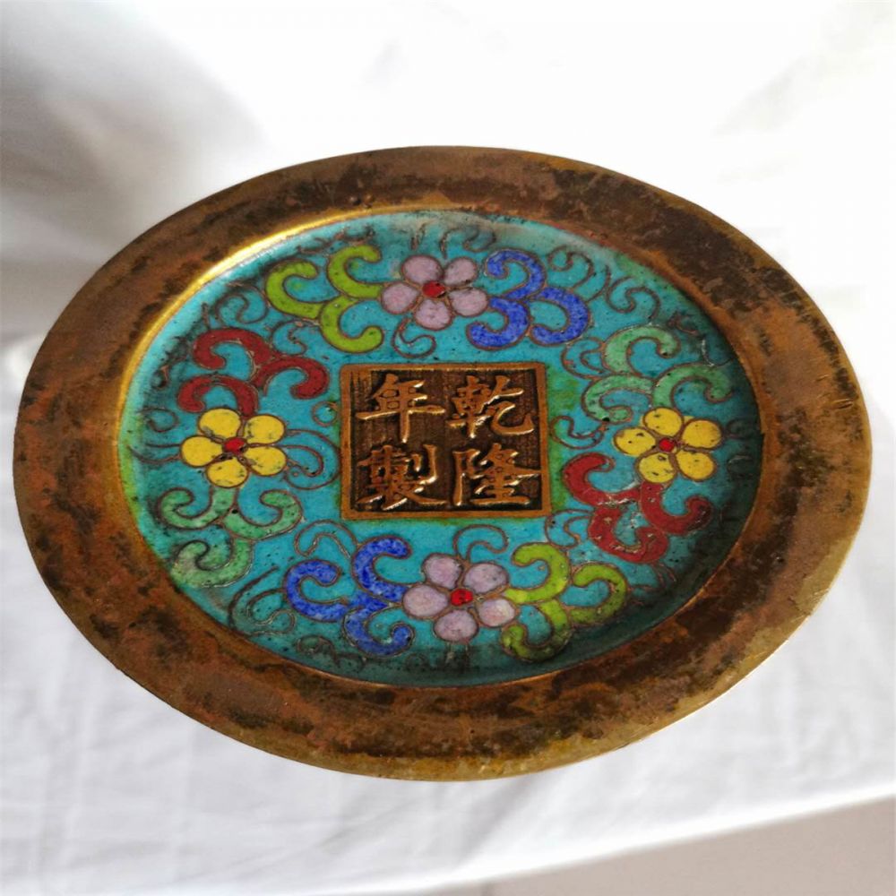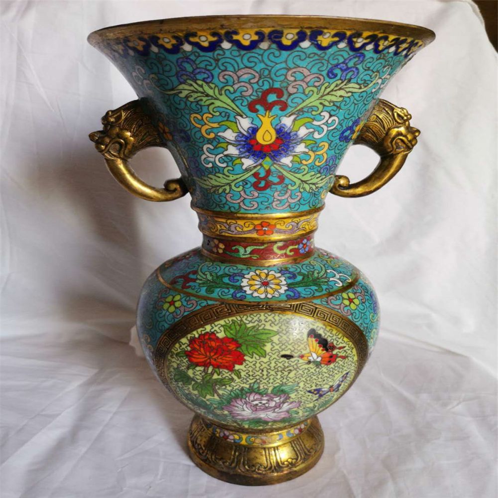 此件铜鎏金掐丝珐琅龙纹双耳花觚 ,口径17厘米,底径9.9厘米,高24.7厘米,重4195克,铜质 。外形显喇叭口,细颈,腹部突,布局疏密有致,周身花纹密集,花朵饱满,花瓣短而肥腴,色彩鲜艳 ,熠熠生辉,有夺人心魄的视觉张力。喇叭形双耳上饰鎏金龙头, 腹部的吉祥纹样细密繁多,各有寓意 。计有象征富贵的牡丹、缠枝莲纹,福禄吉祥的彩蝶,呈现花开富贵景象, 视觉强烈,疏密有致,主次 分明,具有高超的绘画造诣。另一特色是色彩极为丰富,深浅过渡自然。底部有鎏金楷书“乾隆年制” 四字双行款,外加掐丝工艺的运用, 愈显出身高贵,皇家风范,光彩夺目!