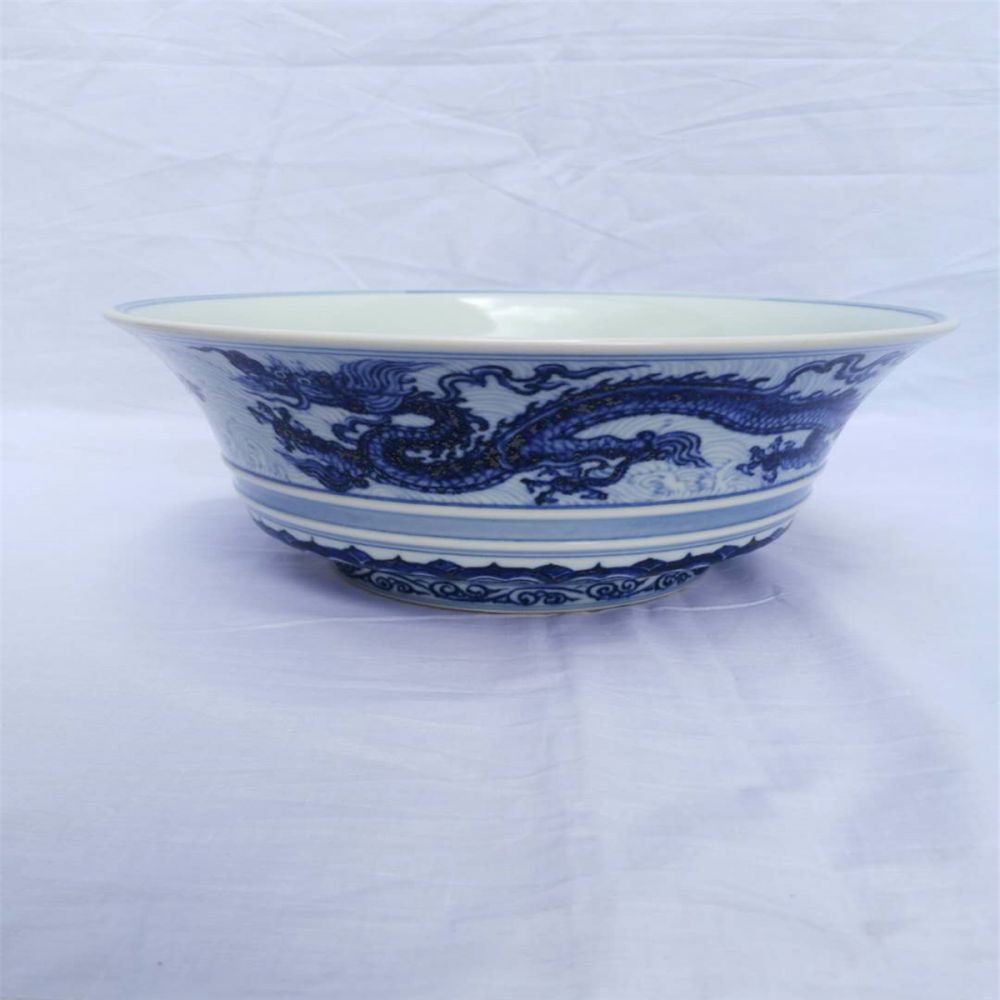 青花龙纹碗,藏品口径: 25.2厘米,底径:13.2厘米,高:11.5厘米,重:1653克。藏品通体饰以青花,大口、圈底,胎土精细,釉汁均净, 造型工整,凝重浑厚,胎质细腻。龙纹纹饰绘画 生动, 龙态有兴云播雨之势;碗造型端正,胎壁厚重,青花色调浓艳,苏麻离青料的特点突出,碗内青花双圈书“大明宣德年制”六字款。此款“青花龙纹碗”周身饰以海水纹,水龙纹图案,浪花纹图案,造 型厚重古朴,青花釉润浓重,是青花瓷器中之代表,亦是青花瓷之珍品。碗腹部描绘两条矫健威猛 的神龙在苍茫无际的大海中遨游,神龙回首曲体,须发飘扬,四肢伸张,呼之欲出。这体现了宣德龙纹描绘最富有生气的特点,龙首威武昂扬,龙嘴高翘,头发长而向上飘起,有双角,龙身舒展 修长,矫健勇猛,多见三爪,体现宫廷龙纹的威慑感。