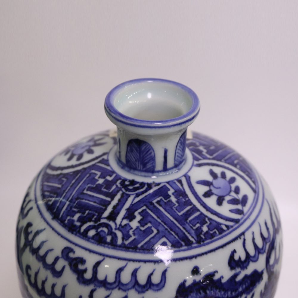 此梅瓶折沿,细颈,丰肩,肩以下渐敛,圈足。外壁自上而下以青花双弦线把纹样分成5层。腹部绘云龙纹。龙昂首前视,飘逸灵动,矫健曲身,极具神采,龙威武生猛。此器釉面肥厚,温润如玉又如脂,造型秀美,做工细腻,云龙纹描绘得形象鲜明,是青花瓷器中的典型器物。