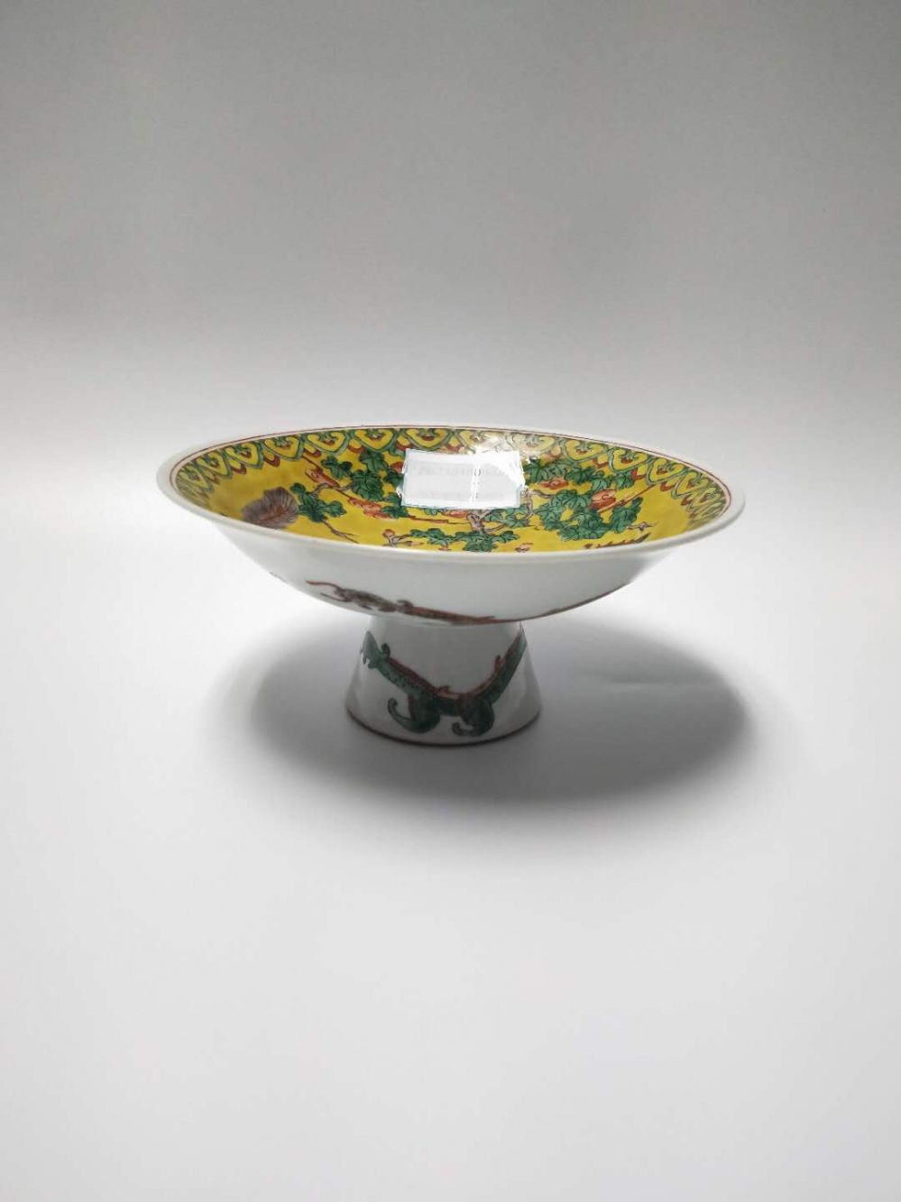 此五彩龙凤纹高脚盘,口径:17cm,底径:6.1cm, 高:7.3cm,大敞口,浅腹弧,矮脚,盘内黄色底釉,色彩清雅,画工细腻,瓷质白细,釉面润泽,造型规整。底款书“大清康熙年制”。