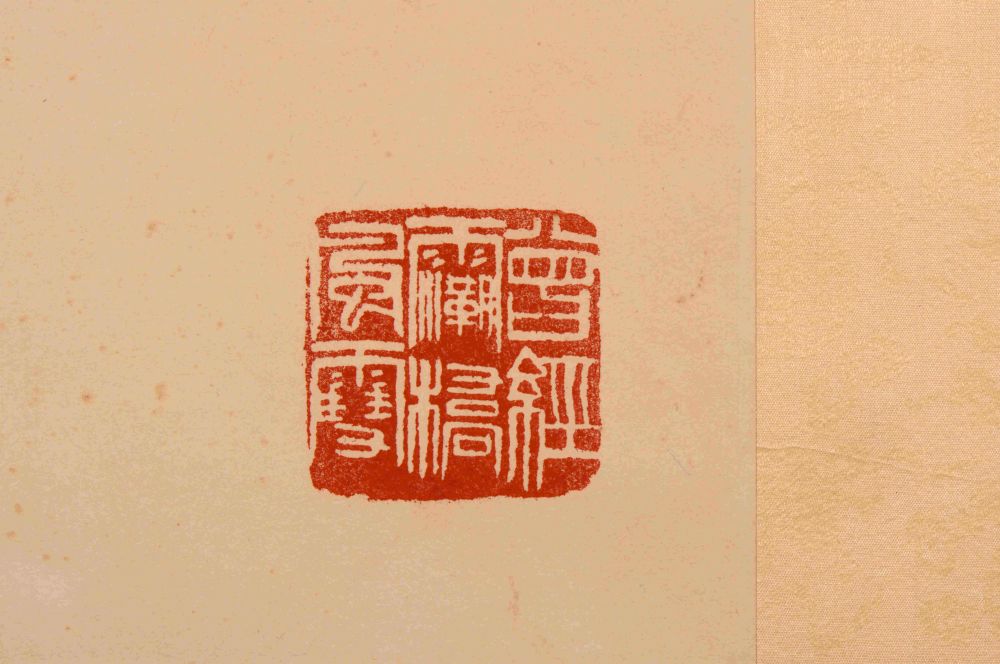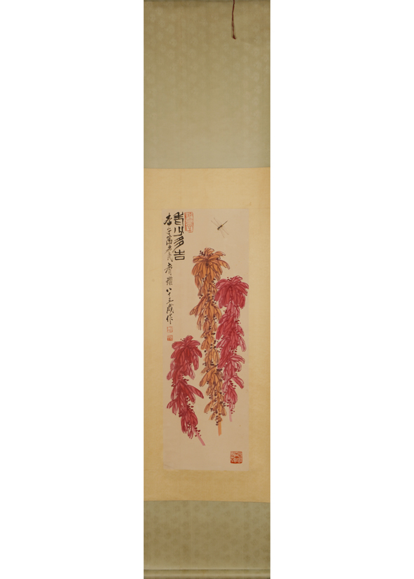 此幅《老少多吉图》构图丰满,设色浓艳,气息充盈。整个画面布满红色,充满喜庆气氛,有一点蜻蜓点缀卜端,义显生动;姑蜓刻曲细致入侬,栩栩如生。单虫绘制形神兼备 者,近代唯齐氏独领风骚。
