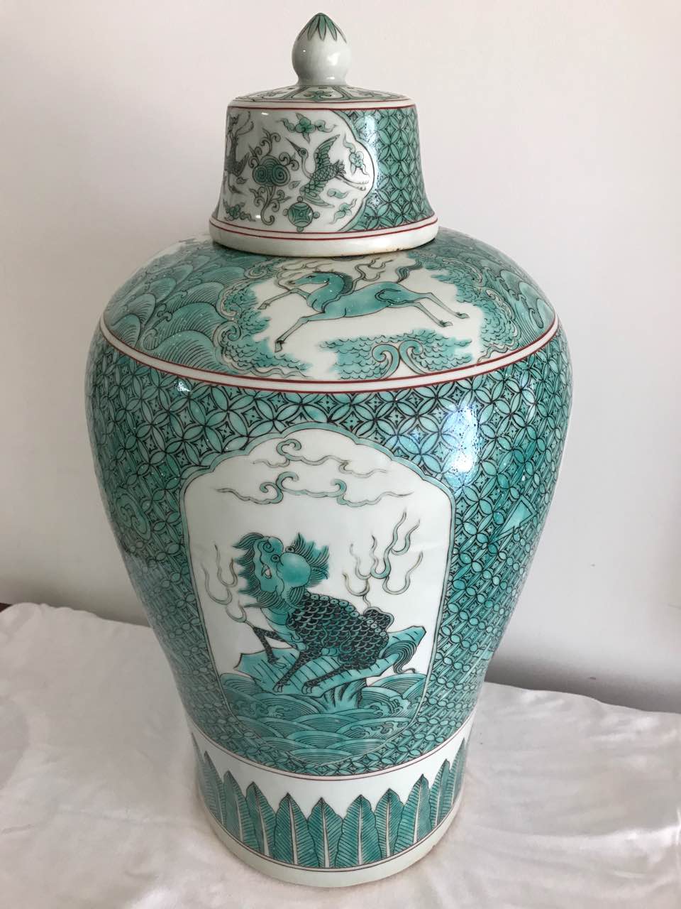 绿彩锦地开光瑞兽纹梅瓶(带盖) |