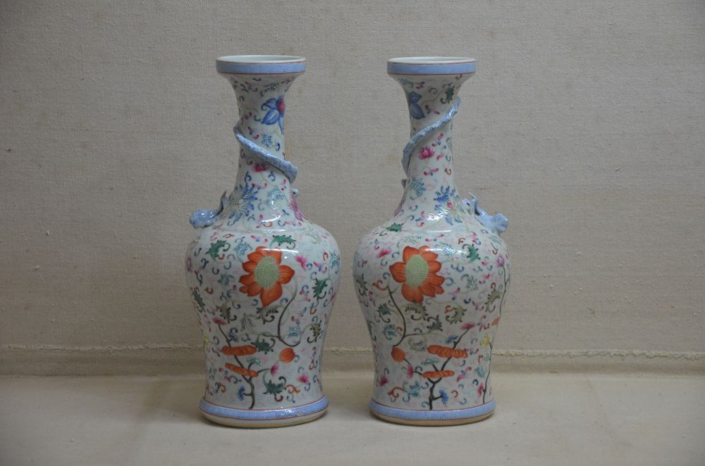 仿官窑,粉彩缠枝牡丹雕塑螭龙瓶一对