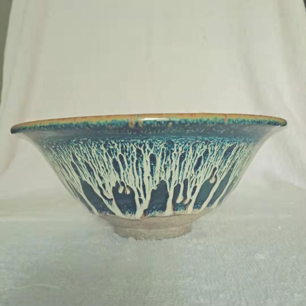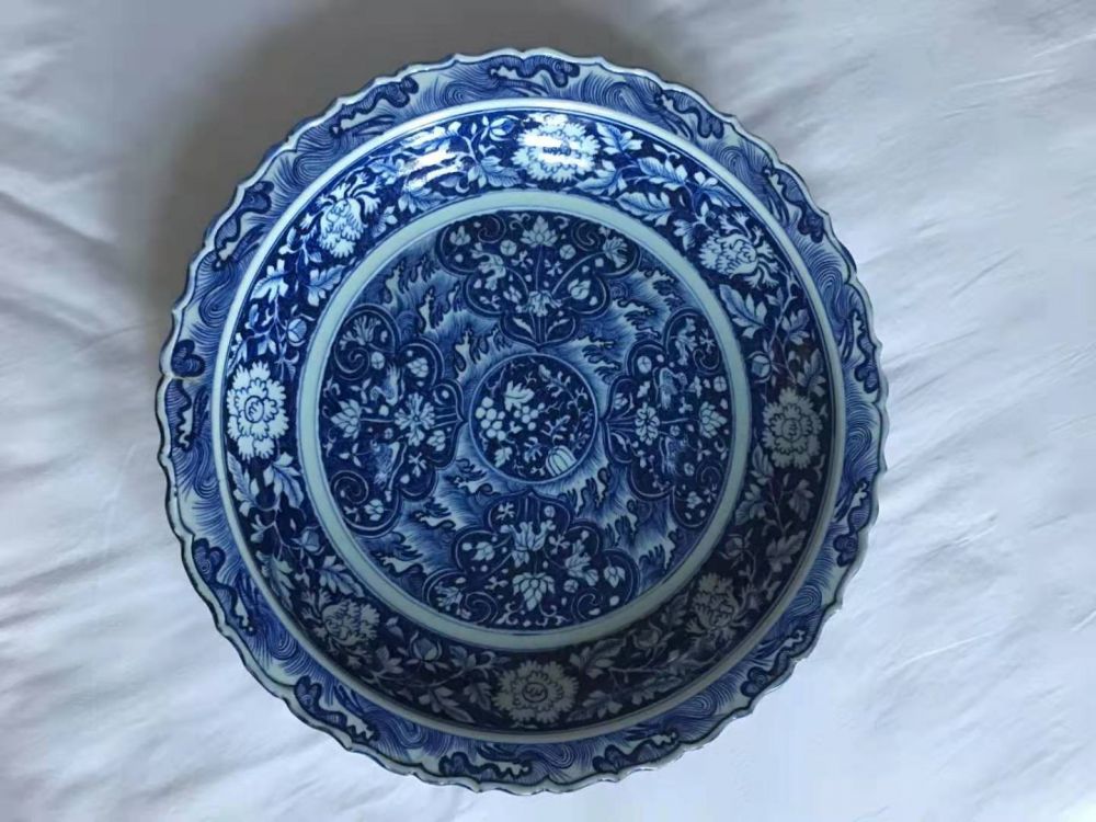 青花留白莲池鸳鸯海水纹菱口大盘 |