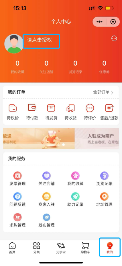 第二步 点击右下角“我的”,再点击上方“请点击授权”。